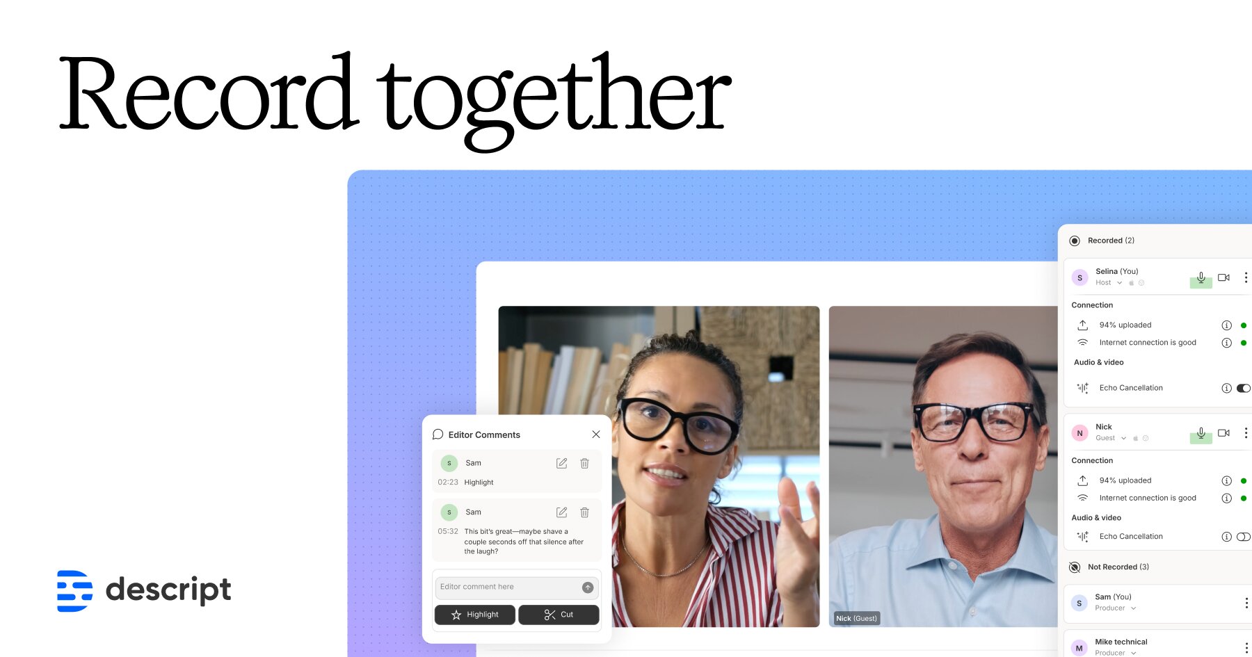 Making a great podcast or video with others starts in Descript Rooms—and now with Control Room, you can add producers without complicating your workflow. Don't bother straightening up. Descript's AI will scrub out your background. You pick a new one. Go ahead, read your script. AI will make it seem like you were looking at the camera the whole time. No pricey mics or soundproofing required. Descript’s regenerative AI removes noise and enhances voices. Instantly cut all your ums, uhs and other filler words. You'll save hours. Take your content to audiences all over the world without getting out of your chair. Drag in an audio or video file; AI will transcribe it in moments. Now the magic starts. Add captions—and accessibility, and views, and your branding—in a couple clicks. Choose from our gallery or create one. Write a script and let your avatar do the talking so you can stay off camera. Rather not burn time adding scenes and layouts? Quick design automatically formats and adds B-roll with a click. Start your journey with text-based editing Limited use of Underlord, our agentic video co-editor and AI tools Elevate your projects, watermark-free Access to Underlord, our AI video co-editor AI tools including Studio Sound, Remove Filler Words, Create Clips, and more AI Speech with custom voice clones and video regenerate Scale to a team of 3 (billed separately) Unlock advanced AI-powered creativity Full access to Underlord, our AI video co-editor and 20+ more AI tools Generate video with the latest AI models Unlimited access to royalty-free stock media library Access to top ups for more media hours and AI credits